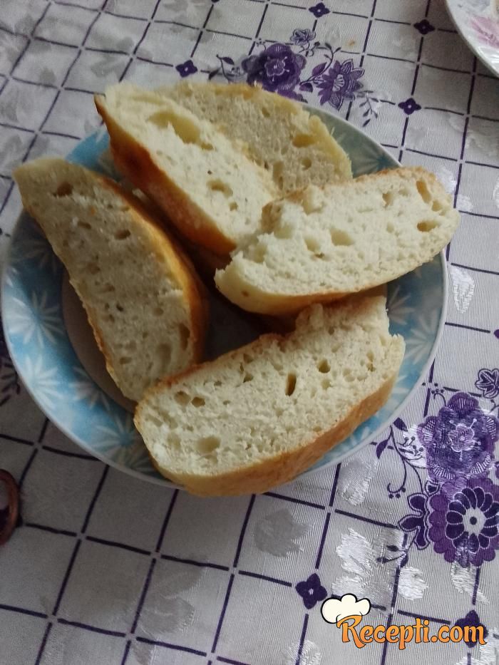 U vanglu sipati brašno, dodati so odokativno rukom isto tako i ulje, ja stavljam maslinovo. U dubljoj džezvi izmrviti kvasac, dodati mu kašičicu šećera, postepeno dodavati u brašno, mesiti kašikom, dodavati još malo vode, da testo ne bude ni previše retko ni previše gusto. Ostaviti pokriveno krpom pola sata da naraste u toplom. Zatim na pobrašavljenoj površini izručiti polovinu testa, oblikovati veknu, prebaciti u pleh obložen pek papirom. isto tako i drugu veknu, sa pek papirom napraviti razmak da se hlebovi ne spoje. Premazati sa maslinovim uljem i žumancetom.
