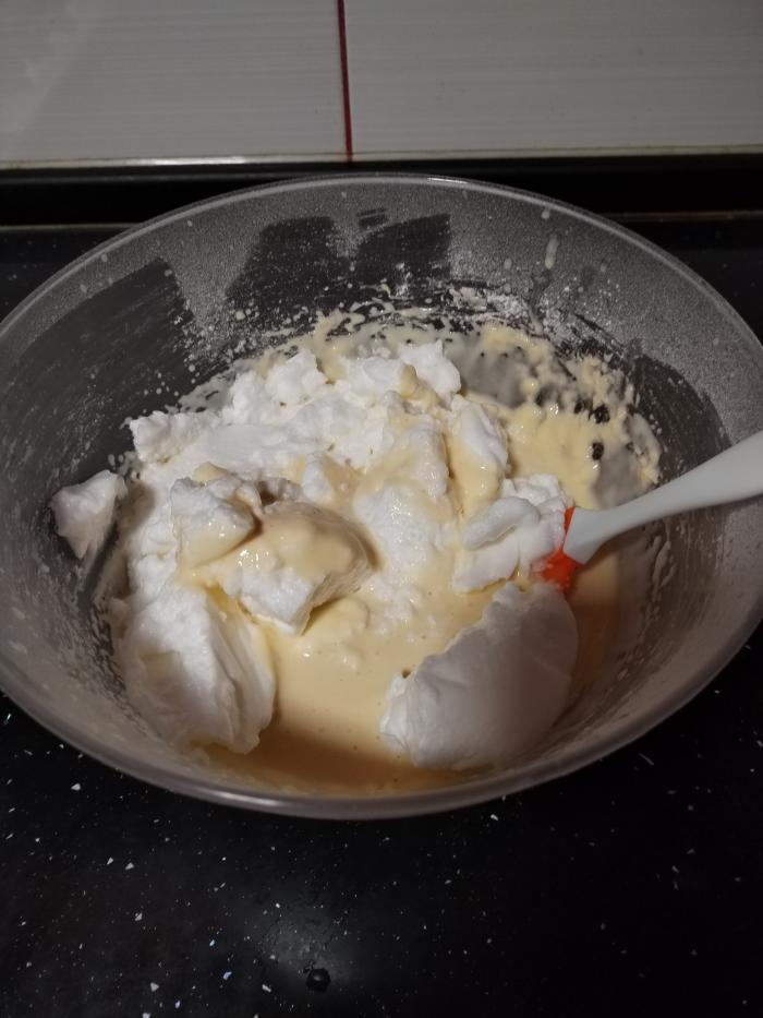 Na kraju smesi sa žumancima dodajte umućena belanca i lagano ih kružnim pokretima promešajte sa ostatkom smese žicom za mućenje.
