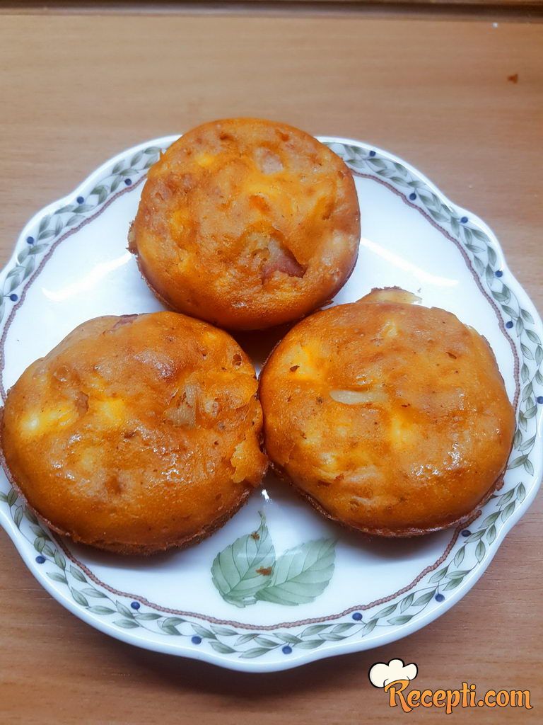 Umutite jaja pa dodajte jogurt, ulje, sve lagano umutite, pa dodajte brašno i pecivo, ponovo lagano umutite i na kraju dodajte origano, kečap, rendan kačkavalj, rendanu šunku i sitno seckanu slaninicu. Sve izmešajte varjačom ili špatulom pa izručite u uljem podmazan kalup za mafine. Pecite u zagrejanoj rerni na 200 stepeni oko 15-20 minuta tj. dok ne porumene.