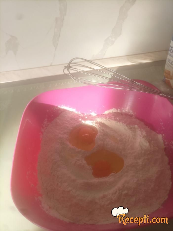 U mlako mleko stavite kvasac, kašikicu šećera i kašikicu brašna i ostavite da kvasac nadođe. U nadošli kvasac dodajte 100 ml mlake vode i 3 kašike ulja. Dodajte brašno, so i 2 jaja.