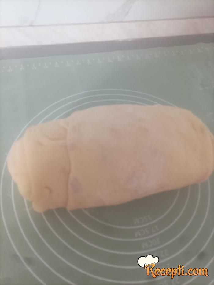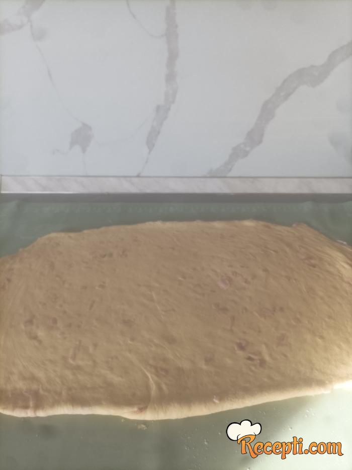 Razvicite ga na dimenziju 30x30 cm. Potrebno je uzeti 1/3 pripremljenog putera i njime premažite testo. Preko stavite 1/3 iseckane šunke. Zatim uvijte u rolat. Prekrijte krpom i ostavite da odmori 10 minuta.Nakon 10 minuta testo razvucite, premažite 1/3 putera, pospite 1/3 šunke, uvijte u rolat sa suprotne strane i ostavite 10 minuta da odmori. Kada je testo naraslo po treći put ponovite postupak.
