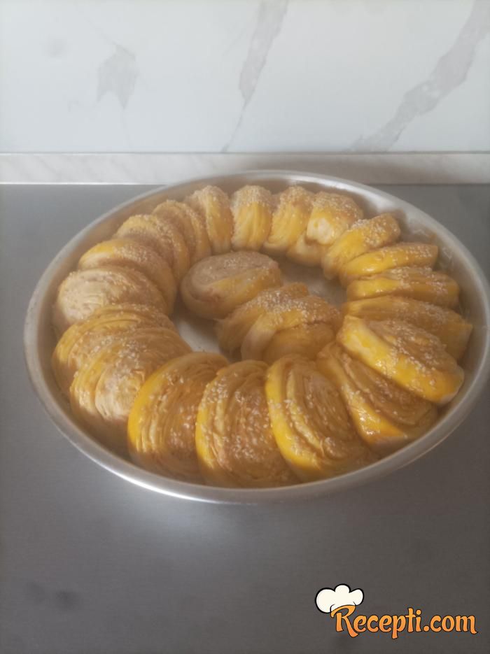 Isecite rolat otprilike na parčad 2 prsta širine i poređajte u pleh u krug jednu preko druge, ali na polovinu, samo je naslonite na prethodni rolat, a zatim popunite i sredinu kruga. Pre pečenja ostavite da naraste testo 10-15 minuta. Zatim premažite jednim žumancetom. Posolite i pospite susamom.