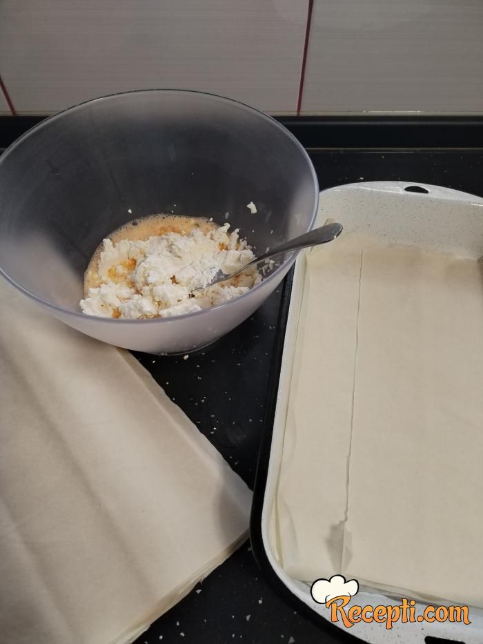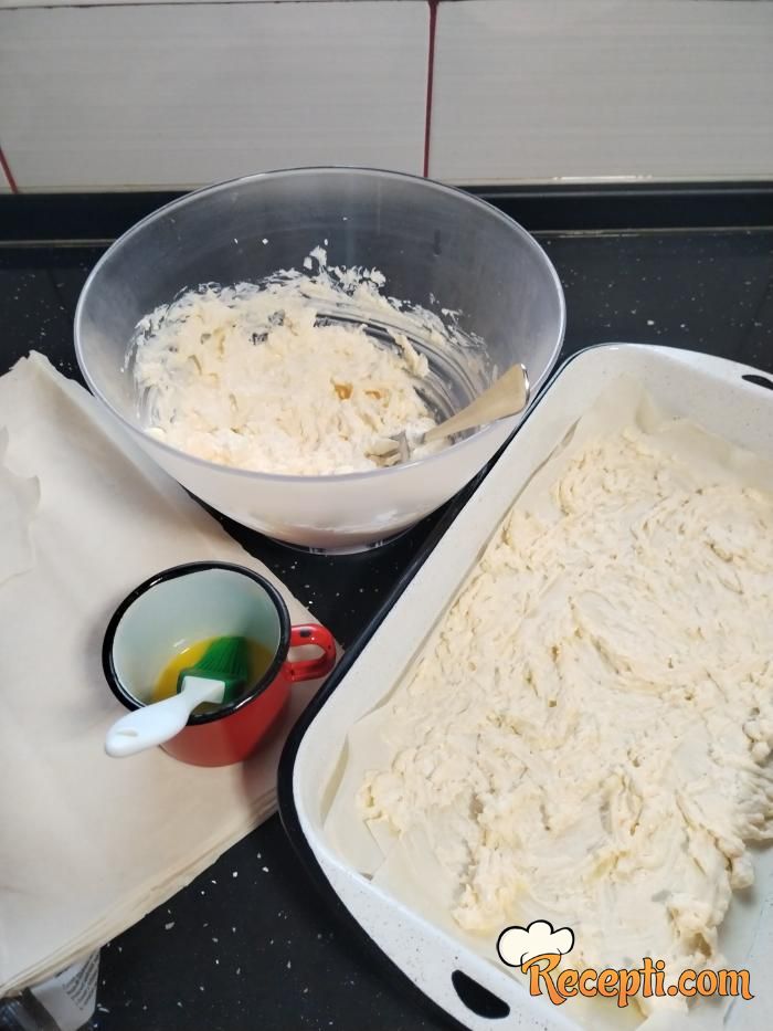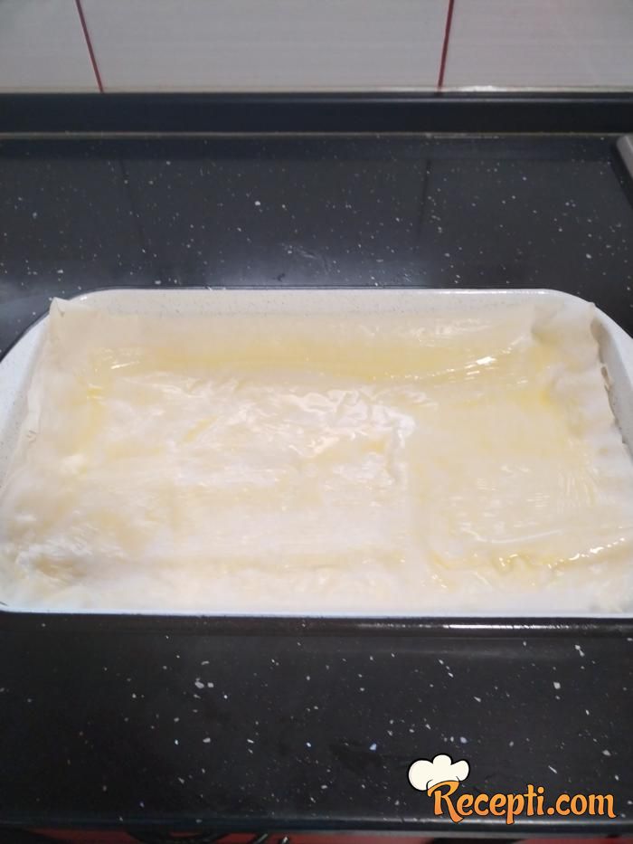 U tepsiju ređajte kore i fil. Poslednju koru premažite puterom i ostavite 5 minuta da odstoji.