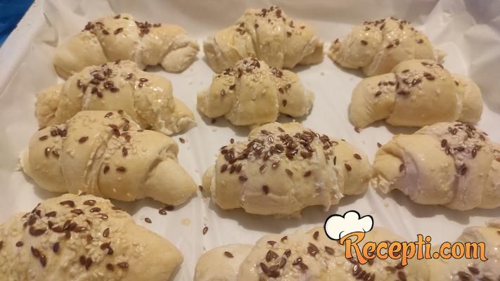 Formirati kiflice i staviti ih u pleh obložen pek papirom. Testo će biti po malo lepljivo zbog sira. Ostaviti oko 20-30 minuta da narastu pa svaku premazati umućenim jajetom, pa posuti mešavinom susama i lanenog semena. Peći u zagrejanoj rerni dok ne porumene. Odlične su i narednog dana, ako ostanu.