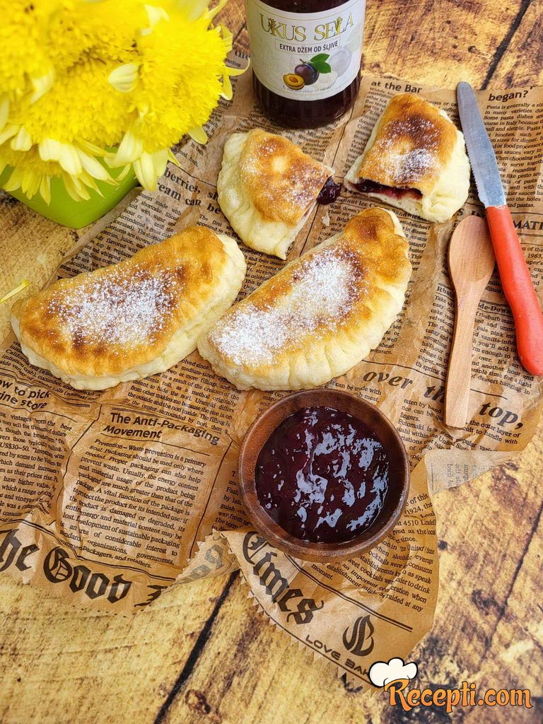 Nadošlo testo premesite i podelite na loptice veličine po želji. Svaku lopticu rastanjite oklagijom u krug, na sredinu stavite kašičicu/ kašiku džema od šljiva. Ukus sela, preklopite i ivice pritisnite viljuškom.