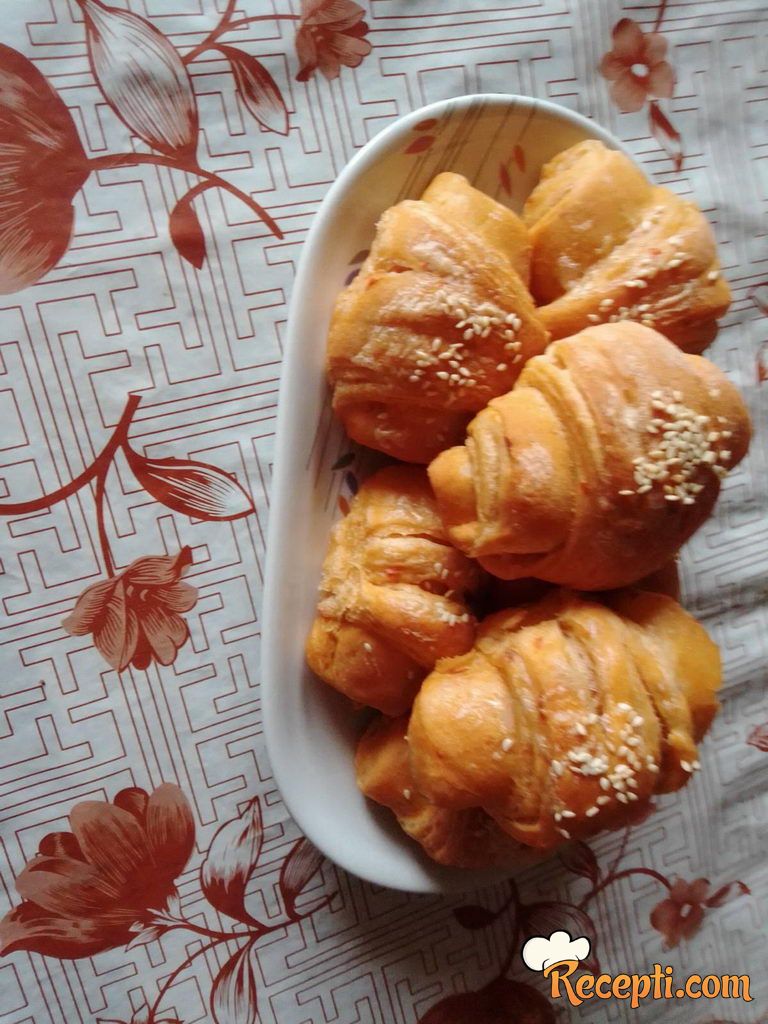 Krugove rastanjiti oklagijom, iseći na 16 delova-trouglova, uviti u kifle, staviti u pleh da narastaju 30 minuta. Premazati majonez i posuti sumamom.