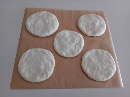 Kvasac usuti u mlaku vodu, dodati šećer, 1 kašičicu brašna, izmešati i ostaviti da odstoji 5 minuta. U dublju posudu usuti 200 g brašna, dodati so i izmešati. Zatim dodati ulje, mlako mleko, nadošli kvasac, izmešati, pa postepeno dodavati brašno i zamesiti mekše testo. Prekriti providnom prijanjajućom folijom i ostaviti da nadođe. Nadošlo testo izručiti na pobrašnjenu radnu površinu, podeliti na 5 delova i od svakog dela testa oblikovati jufkice. Pek-papir staviti na sto. Preko pek-papira poređati jufkice, prekriti ih kuhinjskom krpom i ostaviti da odstoje 5 minuta.
