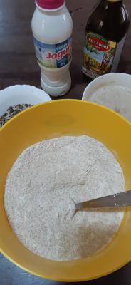 U brašno dodajte semenke, jogurt, maslinovo ulje i nadošli kvasac i zamesite meko testo.