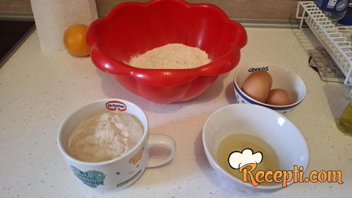 Potopiti kvasac u šolji mleka sa kašičicom šećera i kašikom brašna. Kada se aktivira dodati u prosejano brašno.