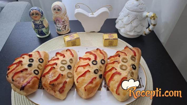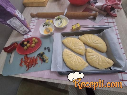 Narasle zemičke nožem zaseći na osmine i premazati umućenim žumancem sa malo mleka. Iseckati papriku i masline.