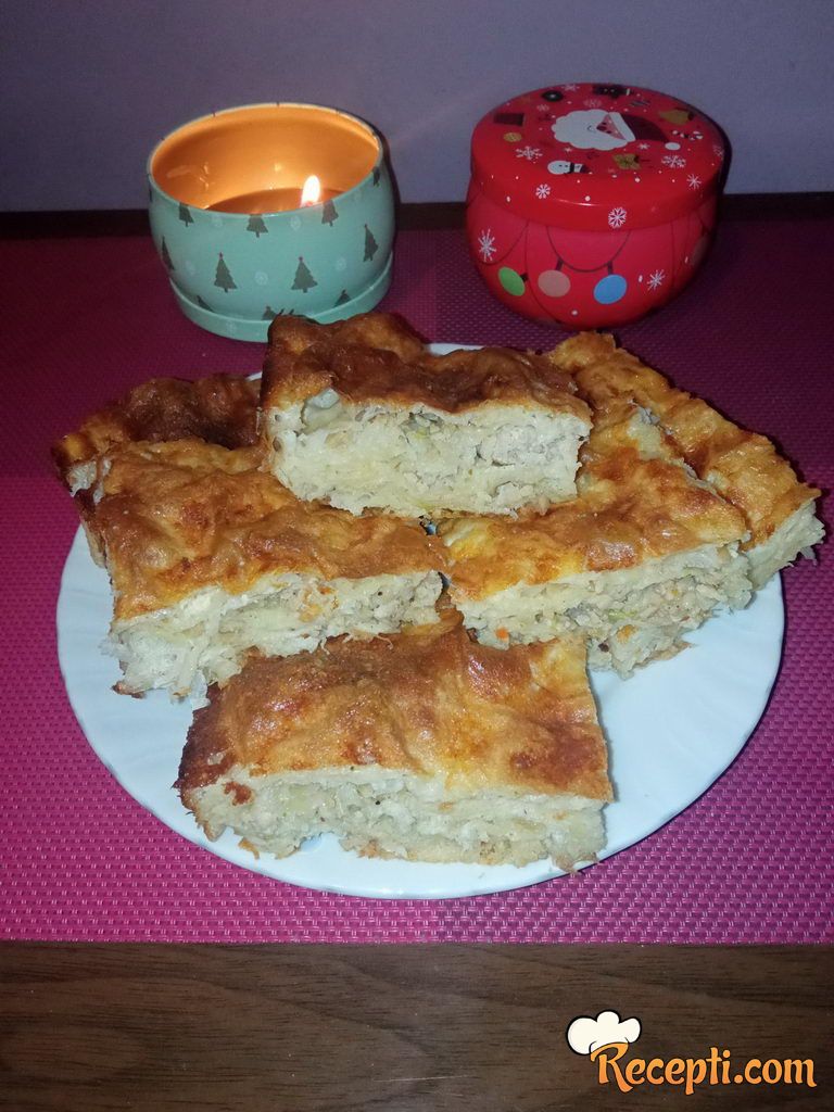 Pleh podmazati uljem. Na dno pleha staviti dve kore. Zatim ređati kore kao za gibanicu i filovati nadevom od mesa i soje. Kada se sastojci utroše, pitu prekriti korom. Iseći pitu na kocke.