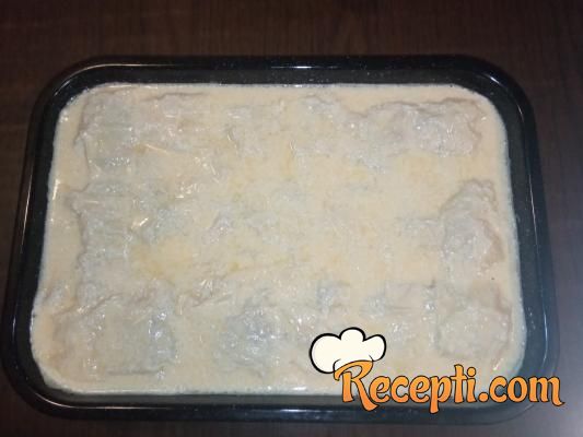 Umutiti jaja, dodati kiselu vodu, kiselo mleko, ulje i so. Izmešati i preliti pitu. Ostaviti da preliv upiju kore.