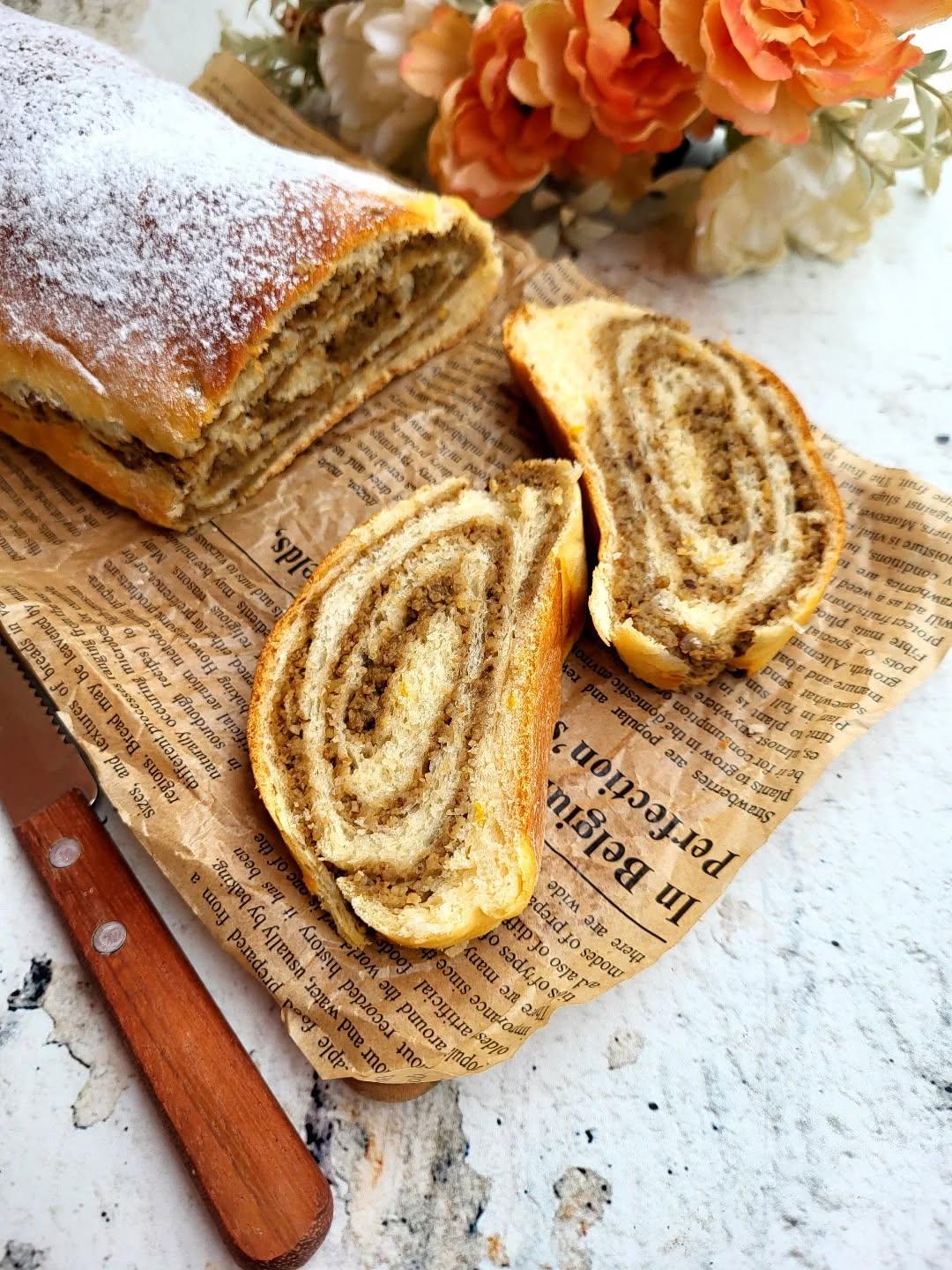 Zamesiti glatko, mekano testo i ostaviti da naraste dok se ne udvostruči. Nadošlo testo premesiti, razviti u pravougaonik što tanje, ravnomerno naneti fil i uviti u rolat. Prebaciti u kalup obložen papirom za pečenje i ostaviti da odmori 15 minuta.