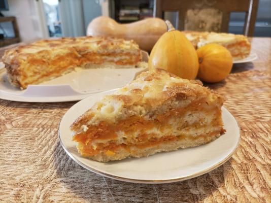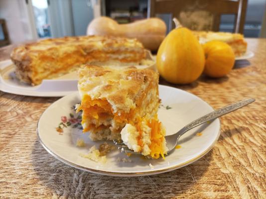 Rernu uključiti da se zagreje na 180 stepeni. U pripremljeni pleh, na dno pleha, krupno narendati 30 g maslaca. Preko staviti jednu trećinu suve smese i kašikom je ispretiskati. Preko rasporediti pola fila od bundeve, pritisnuti kašikom, pa staviti drugu trećinu suve smese. Rasporediti preko drugu polovinu bundeve i posuti sa ostatkom suve smese. Poravnati površinu i ispretiskati kašikom. Celu površinu izbockati, do dna, štapićem koji je malo deblji nego štapić za ražnjiće. Preliti sa hladnim mlekom i naginjati kalup da bi se mleko ravnomerno raspodelilo. Sačekati da pita upije mleko, pa preko narendati 30 g maslaca i staviti pitu da se peče 50-53 minuta.