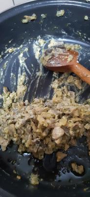 Zagrejte ulje pa dodajte maslac i kada se maslac otopi i zagreje stavite sitno naseckan crni luk da se dinsta 3 minuta. Dodajte sitno naseckane šampinjone i dinstajte sve zajedno, uz povremeno mešanje, oko 15 minuta. Dodajte so, biber i peršunov list po ukusu, umešajte senf, kiselu pavlaku i belo vino, lepo sve izmešajte i sklonite sa ringle da se prohladi.