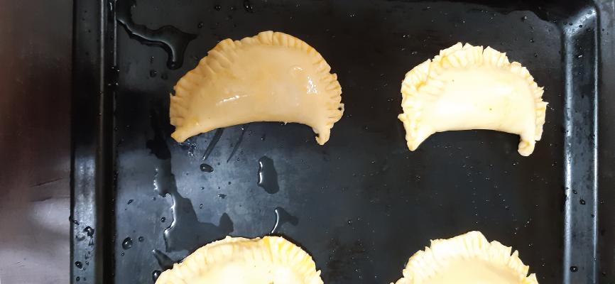 Preklopite i pritisnite ivice testa da se dobro slepe. Premažite odozgo kalcone žumancetom i poređajte na navlažen pleh.