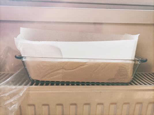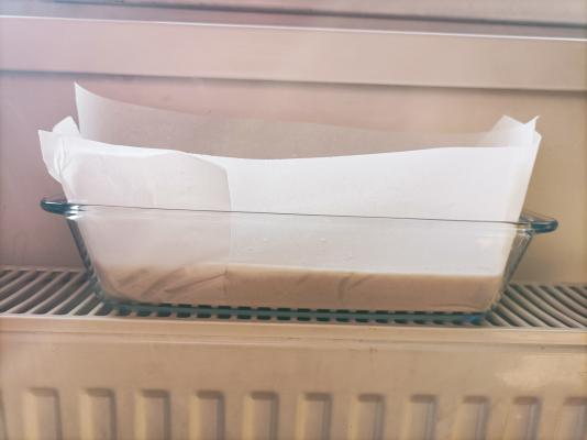 Zatim, smesu izručiti u pripremljeni kalup (ona je jako tečna, kao gusti sok). Kalup prekriti običnom najlon kesom i ostaviti na toplom jedan sat...