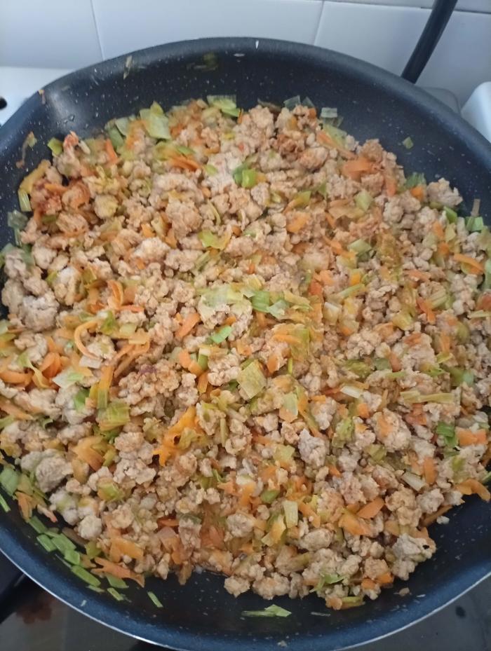 Luk i šargarepu izrendati i staviti da se proprži na malo ulja. Zatim dodati meso i začine. Pržiti dok meso malo ne omekša i promeni boju.