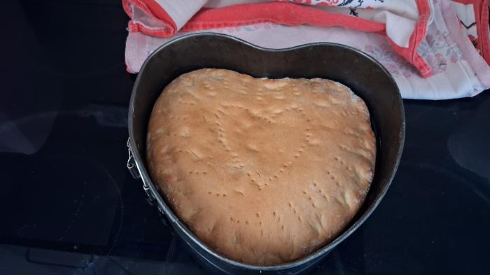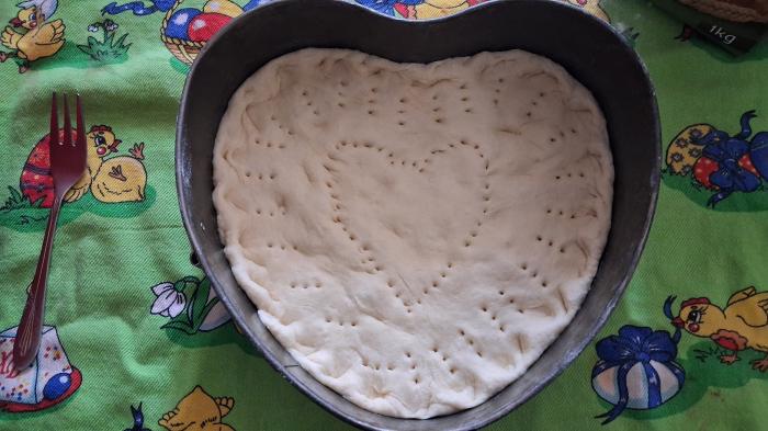 Naraslo testo premesiti i rastanjiti u kalupu za pečenje. Po obodu pogače utisnuti ivicu sa dva savijena prsta, a viljuškom izbockati šare po celoj površini. Ostaviti oko 15 minuta da malo naraste.