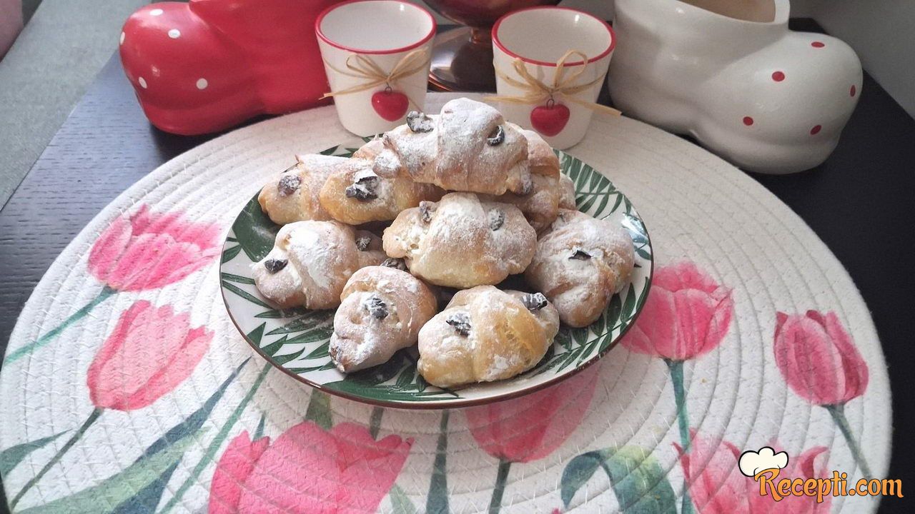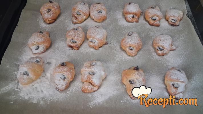 Naraslo testo podeliti na dva dela i svaki od njih rastanjiti u krug i iseći na po 16 trouglova. Na trouglove stavljati po pola kašičice džema.