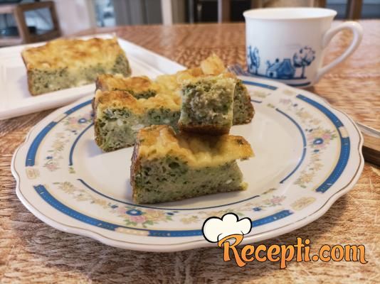 Manji pleh veličine 23 cm x 13 cm x 5 cm obložiti pek papirom i papir samo malo premazati uljem. Rernu zagrejati na 180 stepeni. Oceđeni brokoli staviti u odgovarajuću dublju posudu i viljuškom ga izgnječiti. Posebno umuti viljuškom jaja, dodati kiselu pavlaku, umutiti sve zajedno i dodati u posudu sa brokolijem. Sjediniti viljuškom. Ubaciti polovinu narendanog kačkavalja i promešati. Posoliti i pobiberiti po ukusu i još jedanput sve promešati. Smesu sipati u pripremljeni pleh, poravnati površinu i posuti sa ostatkom kačkavalja. Staviti da se peče oko 25 minuta. Pečenu pitu malo prohladiti, izvaditi iz pleha, prebaciti na odgovarajuću tacnu pa je iseći.