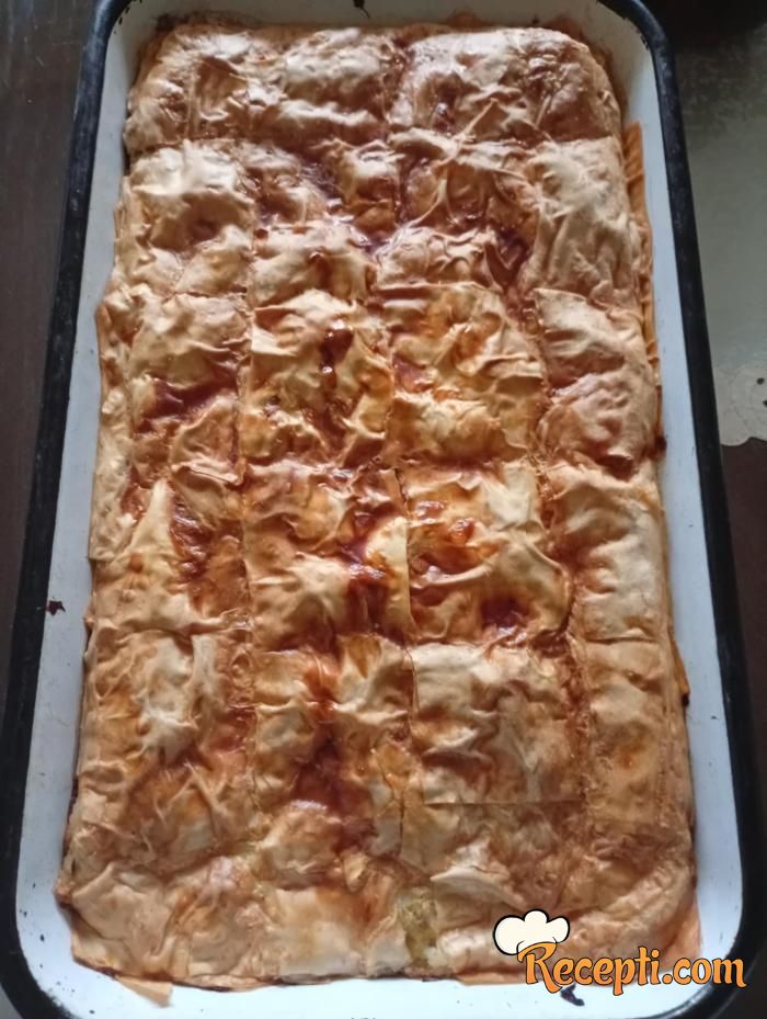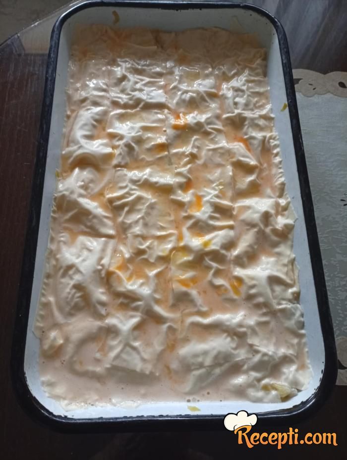 Pleh za pečenje podmazati sa uljem i staviti dve kore. Rasporediti 3 kašike fila, pa ponovo staviti dve kore, fil i tako redom dok se sve ne potroši.