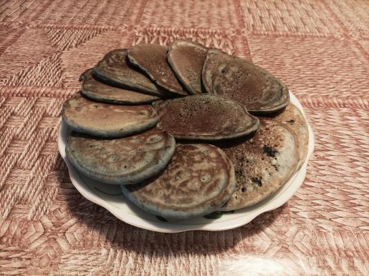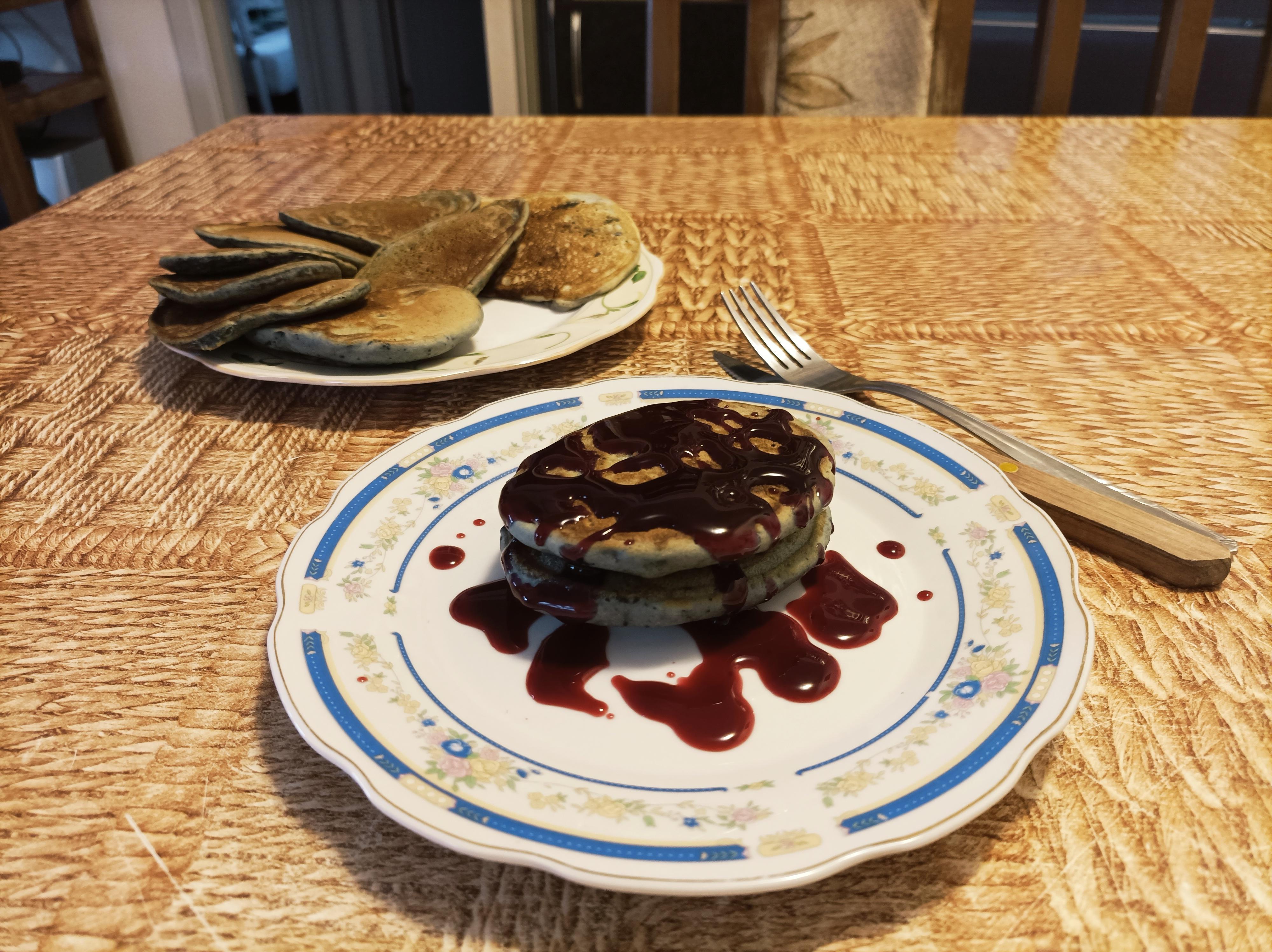 Tiganj sa nelepljivim dnom premazati uljem i staviti da se zagreje na srednjoj temperaturi. Na zagrejani tiganj stavljati po dve kašike testa, jednu preko druge, testo će se samo raširiti, poklopiti i pržiti dok se na površini ne pojave mehurići i dok površina malo ne očvrsne. Tada silikonskom špatulom preokrenuti palačinke, ponovo poklopiti i pržiti kratko da i donja strana porumeni. Tiganj uvek premazati uljem pri svakom novom dodavanju testa. Pržene palačinke ređati na odgovarajuću tacnu. Palačinke poslužite prelivene sa prelivom od borovnica. Uživajte...