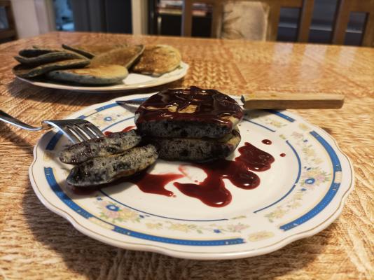 Preliv: U manju šerpicu staviti sok koji su pustile borovnice prilikom odmrzavanja (ako koristite sveže borovnice, tada uzmite kupovni sok od borovnica i stavite 120 ml, bez vode. Tada vam ne treba šećer, jer je sok već zaslađen), dodati šećer i gustin, dobro promešati da se gustin otopi i staviti na srednju vatru da se kuva. Uz stalno mešanje kuvati dok preliv ne počne da se zgušnjava. Tada skloniti sa vatre i ostaviti da se hladi, dok se prže palačinke.