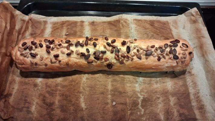Saviti bočne ivice testa i zarolati pitu. Premazati rolnu posnim majonezom i po vrhu posuti mešavinom zrnevlja po izboru (koristila sam mešavinu za obrok salatu).
