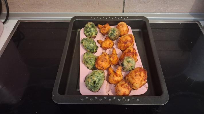 Od naraslog testa odvojiti 1/4 i podeliti je na dva dela. U jedan deo dodati kašiku ajvara, a u drugi odmrznut i oceđen spanać. Dodati malo brašna i premesiti u zelenu i narandžastu lopticu. Testo deliti na manje loptice i utisnuti u silikonski kalup sa uskršnjim motivima jaja i zeka.