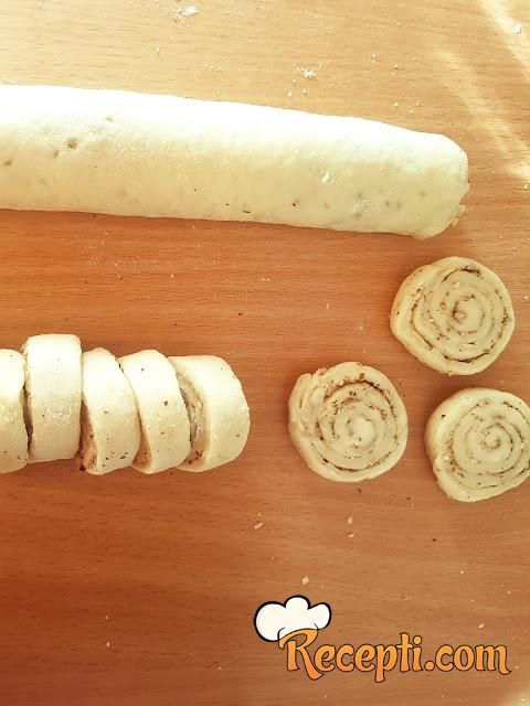 Svaki deo razvucite oklagijom krug debljine oko 5 mm pa ga pospite mlevenim pečenim lešnikom (ja sam ga izblendirala). Zatim malo pređite oklagijom po površini kako bi se lešnik spojio sa testom. Urolajte i secite na komade širine oko dva prsta. Ređajte na pouljanom plehu. Isto uradite i sa drugom polovinom testa. Pecite ih u zagrejanoj rerni na 200 stepeni oko 20 minuta (zavisno od vaše rerne). Za to vreme skuvajte sirup od vode i šećera, ni suviše gust, a ni suviše redak. Na kraju dodajte limun isečen na kolutove.