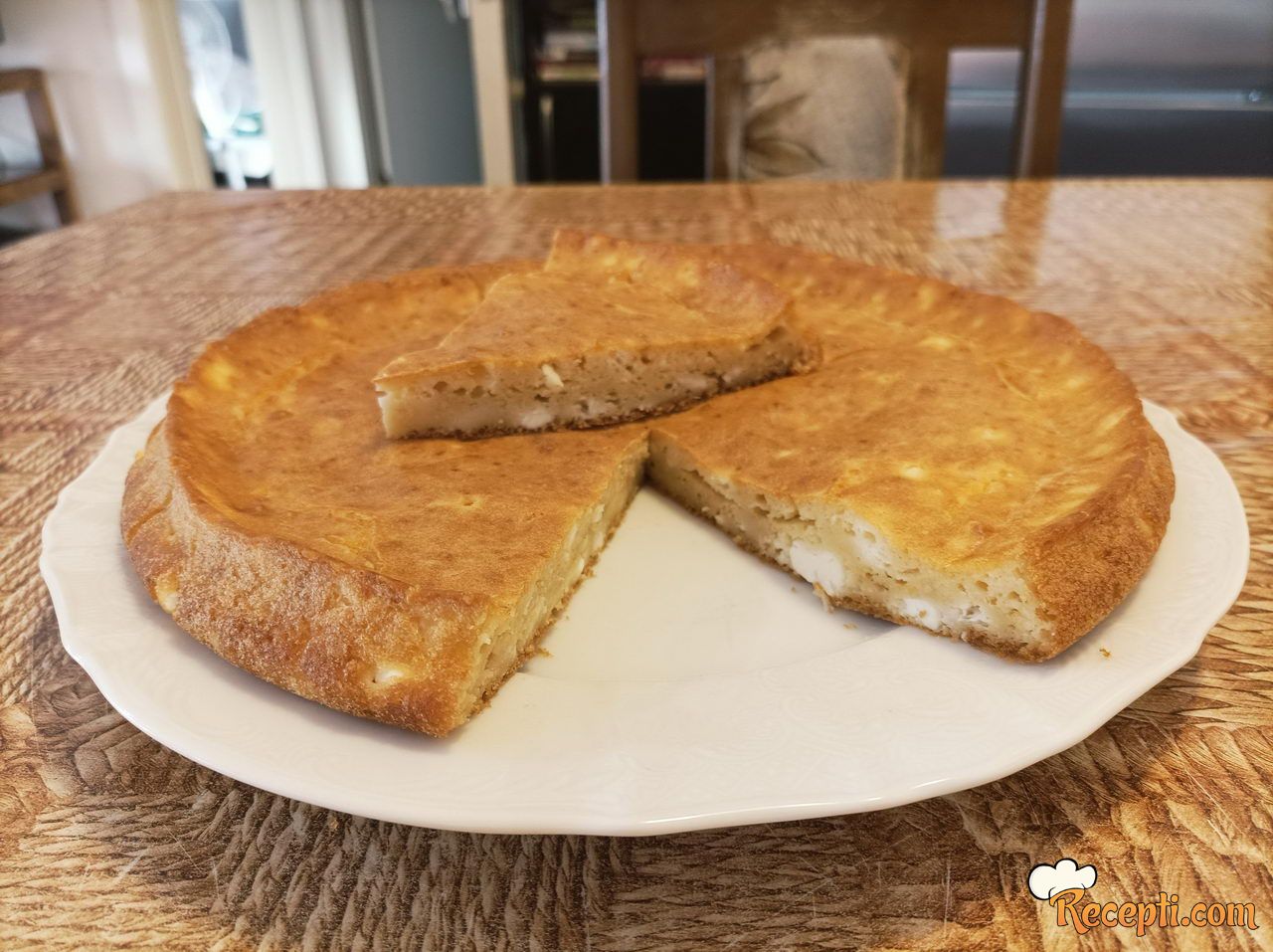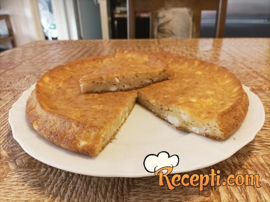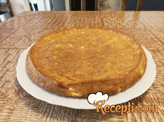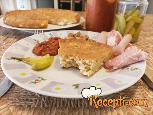 Jaja razbiti u vanglicu i umutiti ih žicom za mućenje. Dodati so i mleko i sjediniti. Zatim dodati omekšalu mast i kajmak, pa mućenjem sve sjediniti (ako i ostanu male grudvice, one će se otopiti). Ubaciti brašno sa praškom za pecivo i dobro umutiti. Na kraku ubaciti feta sir koji smo rukama izmrvili. Kašikom promešati i sipati u pripremljenu tepsiju. Poravnati površinu i staviti da se peče 20 minuta, odnosno dok ne dobije lepu rumenu boju.