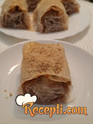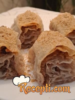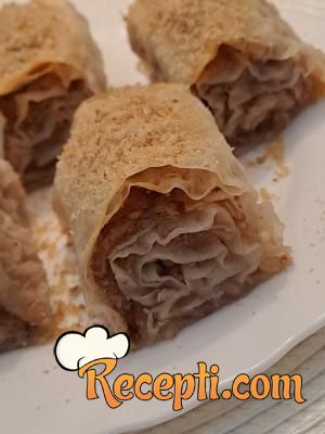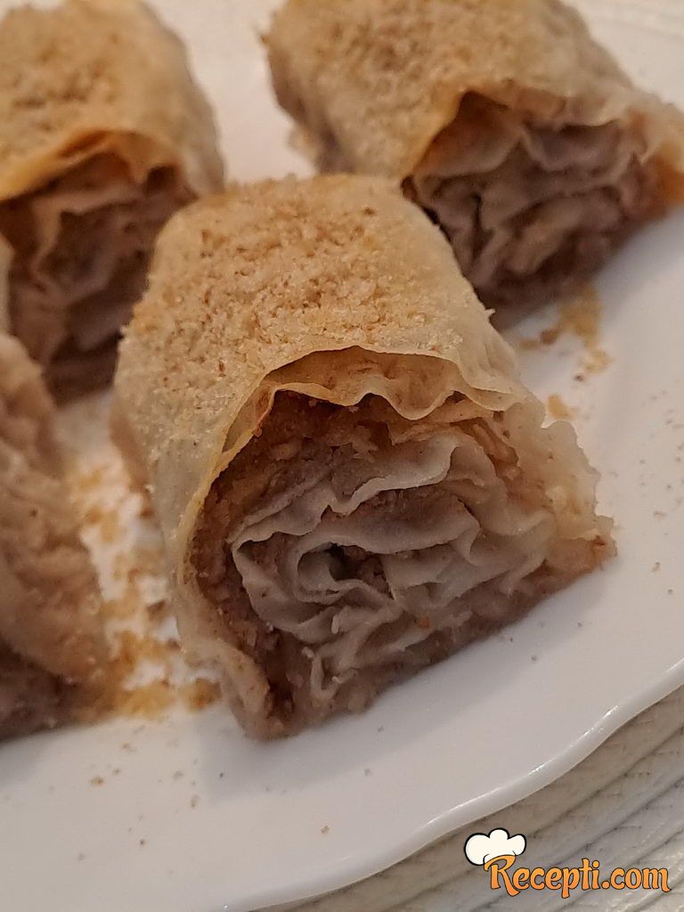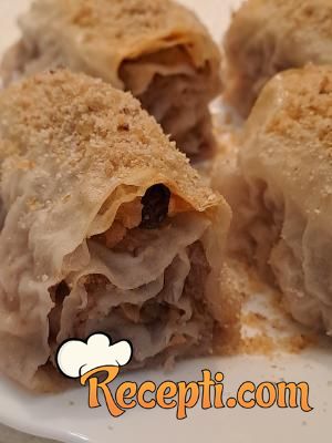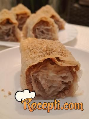 Na radnu površinu staviti jednu koru, premazati je četkicom mešavinom ulja i vode. Preko staviti drugu koru. Posuti je sa 2-3 kašike mešavine oraha ravnomerno, pa po njoj ravnomerno rasporediti rendane jabuke i posuti malo suvog grožđa. Uviti u rolat i preneti u podmazan pleh. Postupak ponoviti sa ostalim korama, tako da dobijete 7 rolni na kraju.