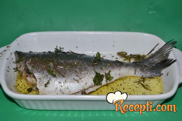 Nakon 15 minuta pečenja preliti ribu sa jedne i druge strane mešavinom soka od limuna i vina i vratiti u rernu da se dalje peče.