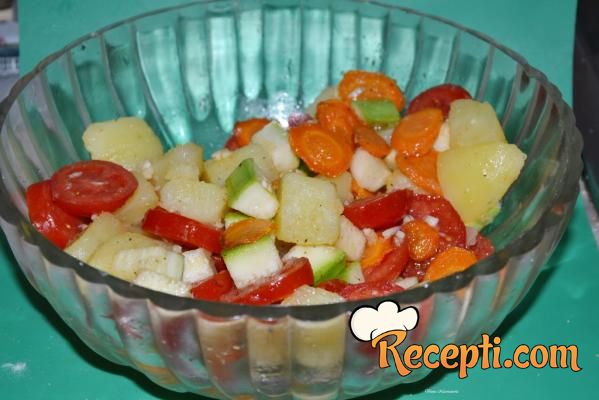 Kada se krompir i šargarepa malo ohlade svo povrće stavite u činiju te začinite biberom i solju i prelijte sa maslinovim uljem.