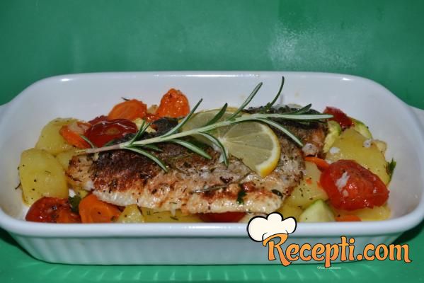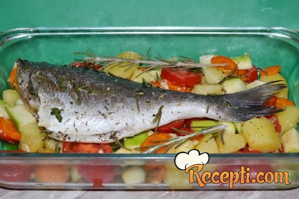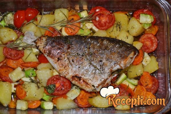 Kako orada nije dobila rumenu boju, kratko sam je propržila na malo ulja u tiganju, sa jedne i druge strane i vratila u vatrostalni sud na povrće. Pospite i malo svežeg peršuna.
