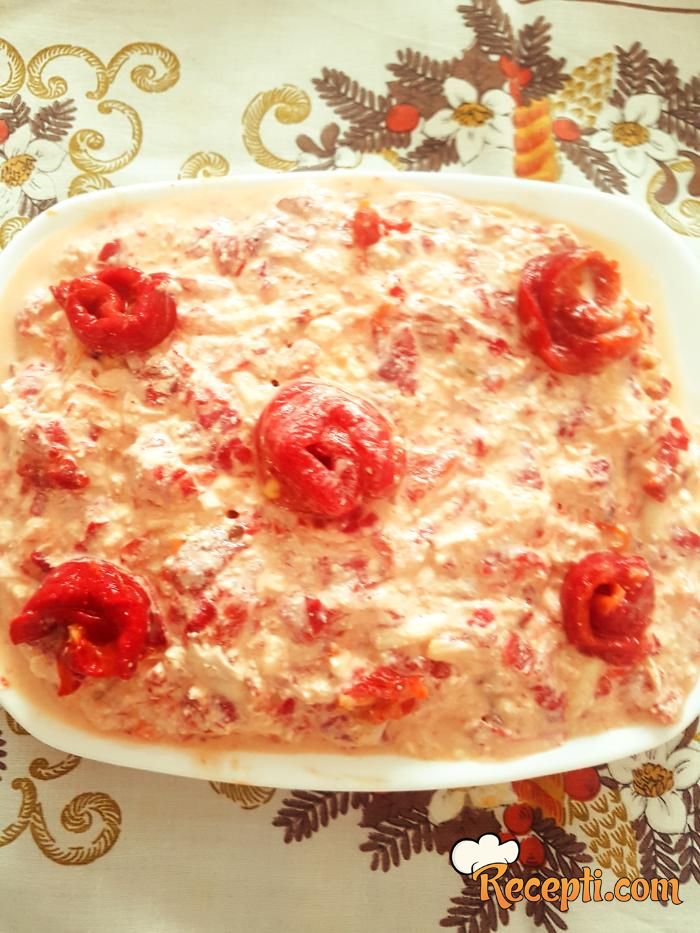U posudu stavite seckanu papriku, rendana jaja, rendan kačkavalja, izmrvljen ili izrendan feta sir i majonez, pa sve lagano izešajte. Posolite po ukusu, dekorišite po želji, ohladite pa poslužite.