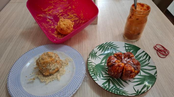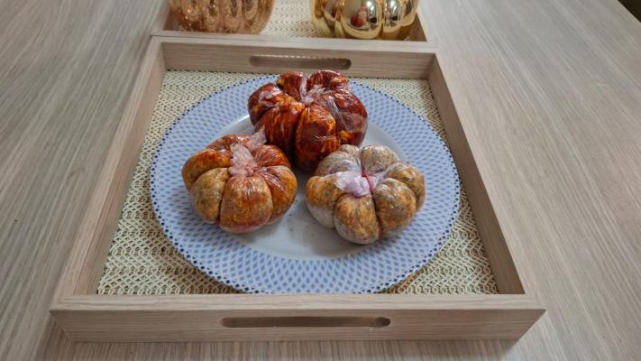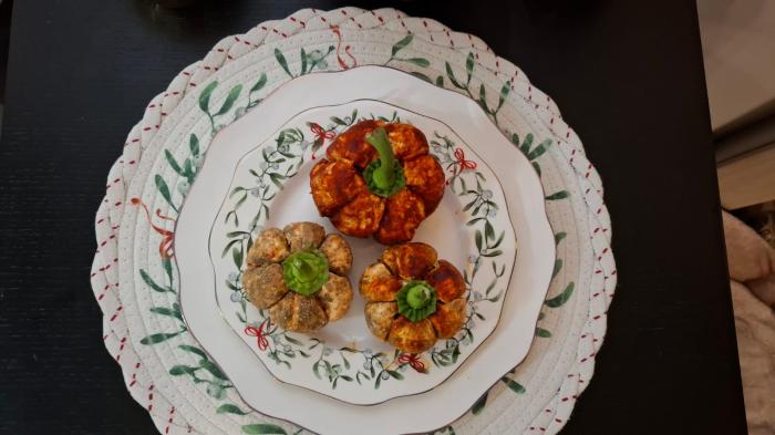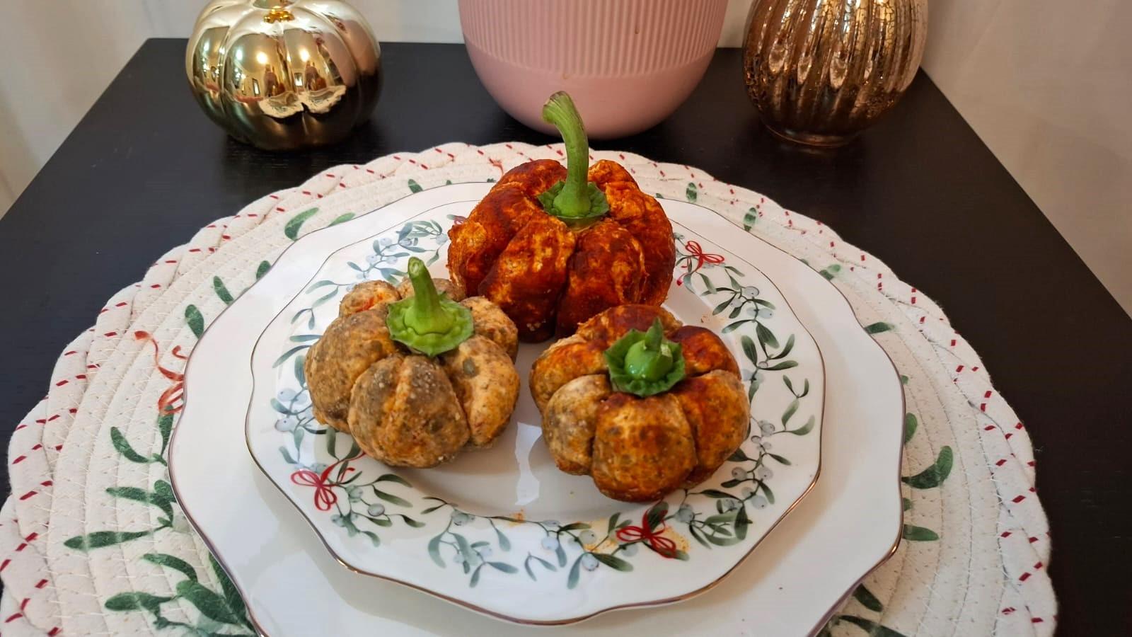Podeliti smesu na pola. Od prve polovine napraviti jednu veću lopticu i na tanjiru obloženom folijom uvaljati u alevu papriku. Zatim foliju skupiti oko loptice, stisnuti na vrhu i pomoću tri gumice napraviti zareze kao na bundevi.