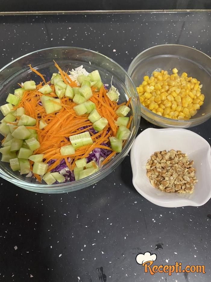 Pospite sitno seckanim orasima. Posolite, pouljite, dodajte sirće i 1 kašičicu šećera pomešano sa malo vode i sve dobro promešajte pa poslužite.