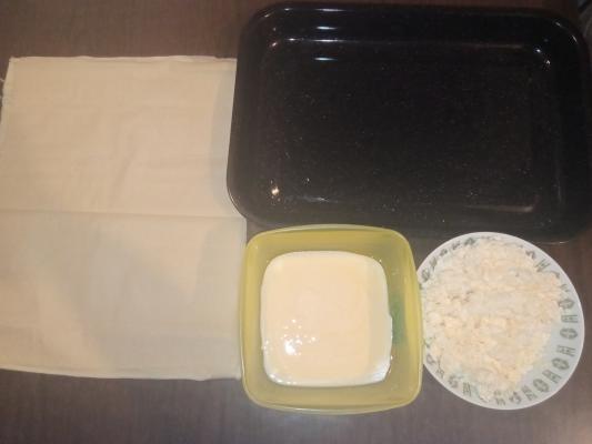 Ređati u podmazan pleh. Ponoviti dok se utroše kore. Malo fila od jaja i jogurta ostaviti da se premažu pužići, ko voli može preko pužića posuti i sir. Odozgo posuti susam.