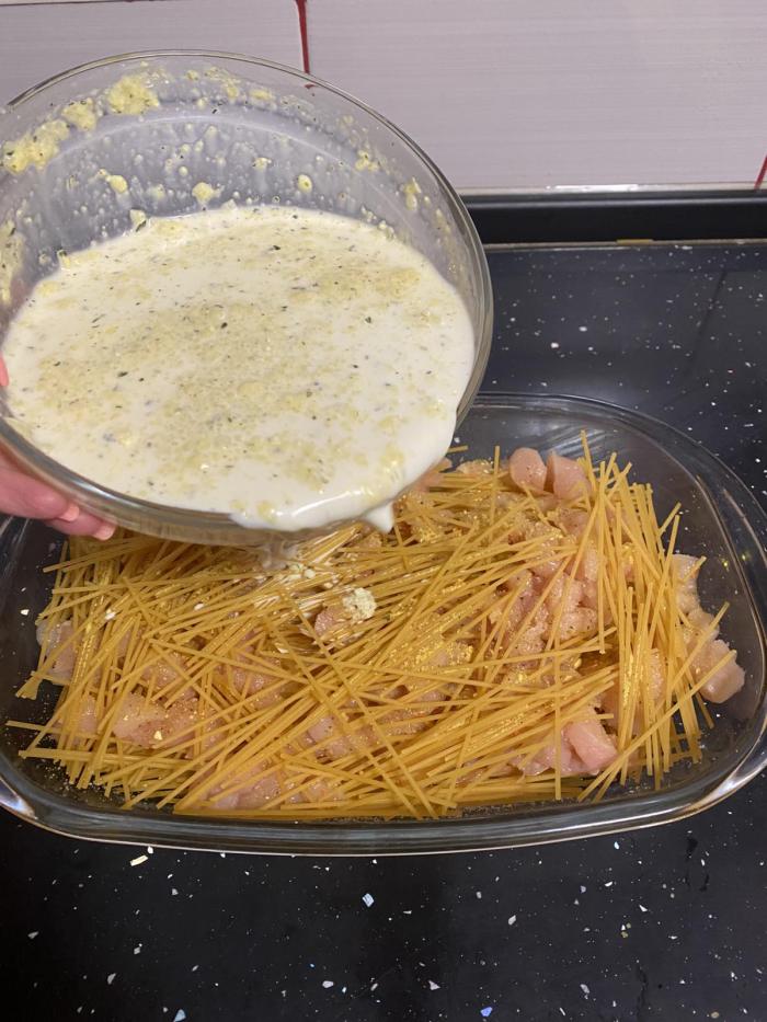 Špagete presecite na pola (nije potrebno prethodno skuvati) i poređajte u vatrostalnu tepsiju. Preko nje stavite piletinu iseckanu na kockice.