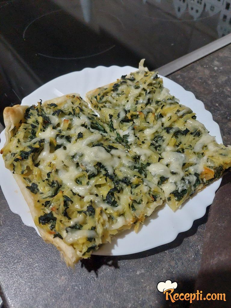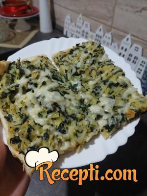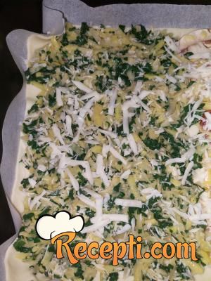 Lisnato testo staviti u veliki pleh. Preliti sa smesom. Zagrejati rernu na 180 stepeni i peći pitu oko 30 minuta.