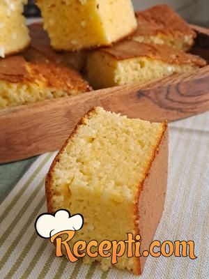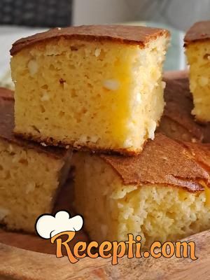 Posle toga sipati smesu u posudu, smanjiti rernu na 200 stepeni i peći 25 do 30 minuta dok ne dobije lepu koricu. Malo prohladiti i seći na kocke.
