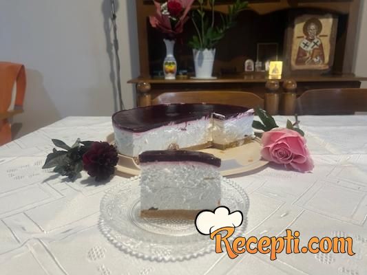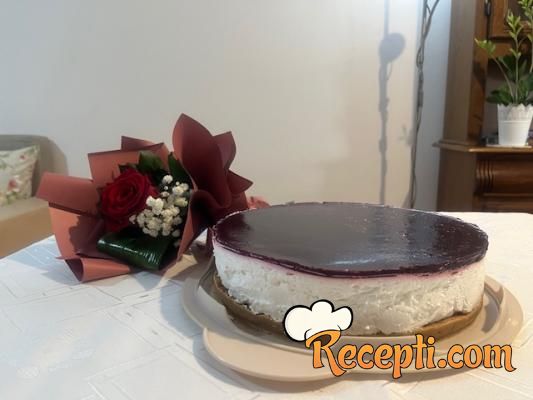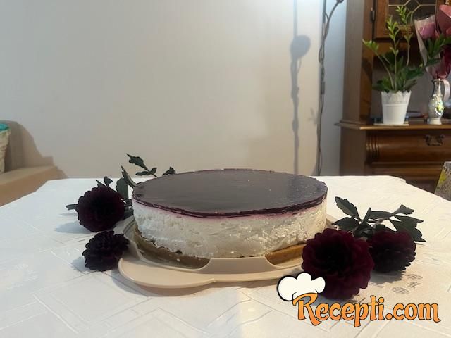 Sipati voćni fil preko belog fila i vratiti tacnu sa tortom u frižider da prenoći. Narednog dana izvaditi tacnu sa čizkejkom iz frižidera i skloniti obruč.