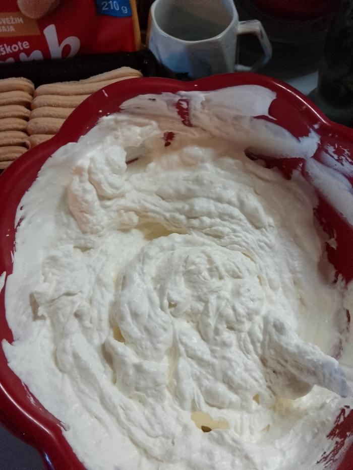 U drugoj posudi umutiti kiselu pavlaku sa 100 g šećera u prahu, pa dodati u umućenu slatku pavlaku, i sve izmešati sa kašikom.