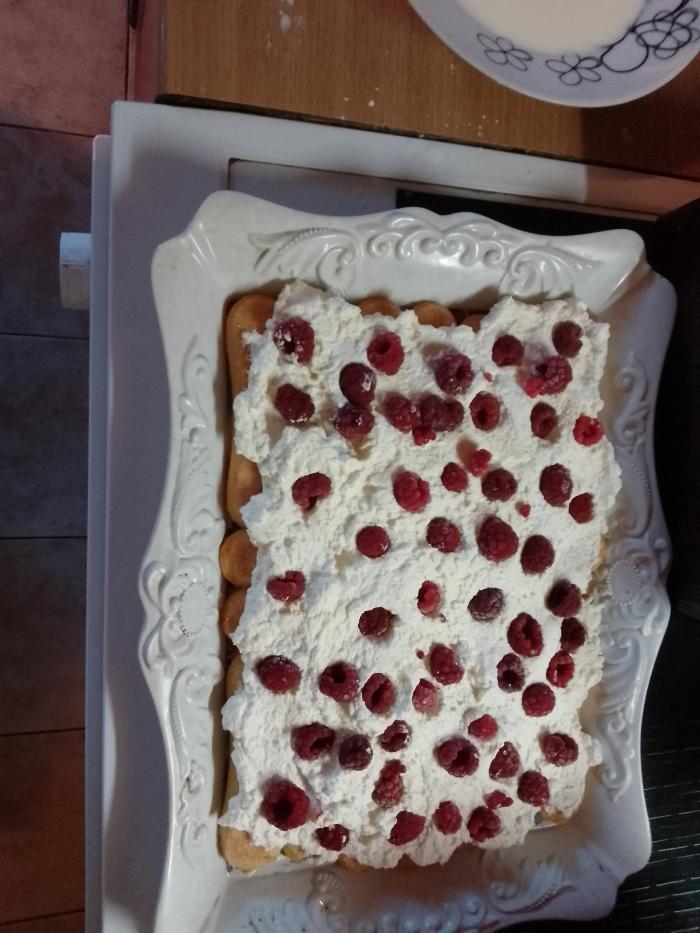 Piškote umakati u mleko i slagati na tacnu za tortu, preko fil, pa maline, tri sloja piškota, tri sloja fila.