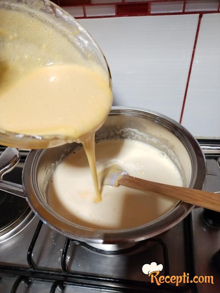 Za pripremu fila umešajte žumanca sa šećerom pa dodajte gustin i malo mleka, umešajte. U šerpicu sipajte ostatak mleka, pa kada se mleko potpuno ugreje dodajte umućenu smesu i mešajte dok se fil potpuno ne zgusne.