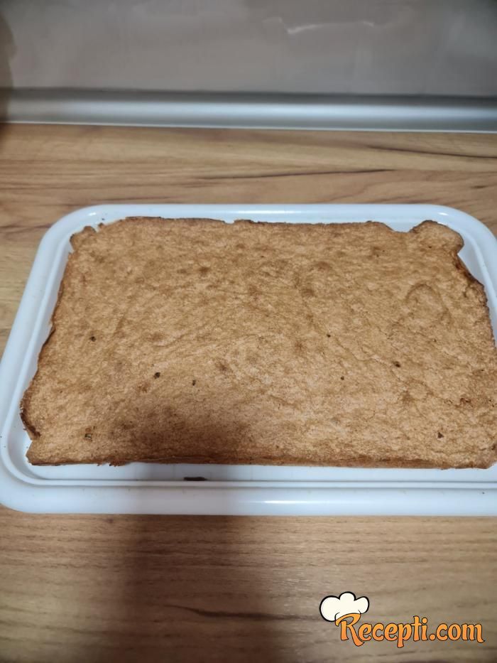 Zatim preko poređajte plazma keks u komadu koji ste na kratko potopili u sok od narandže