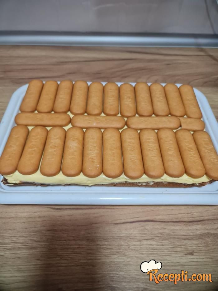 Za fil 6 žumanaca umutite mikserom sa 4 kašike šećera, a posebno izmešajte puding od vanile (prašak) sa 1 dl mleka pa sve spojite i dobro izmešajte. Možete dodati i jednu kašiku gustina.