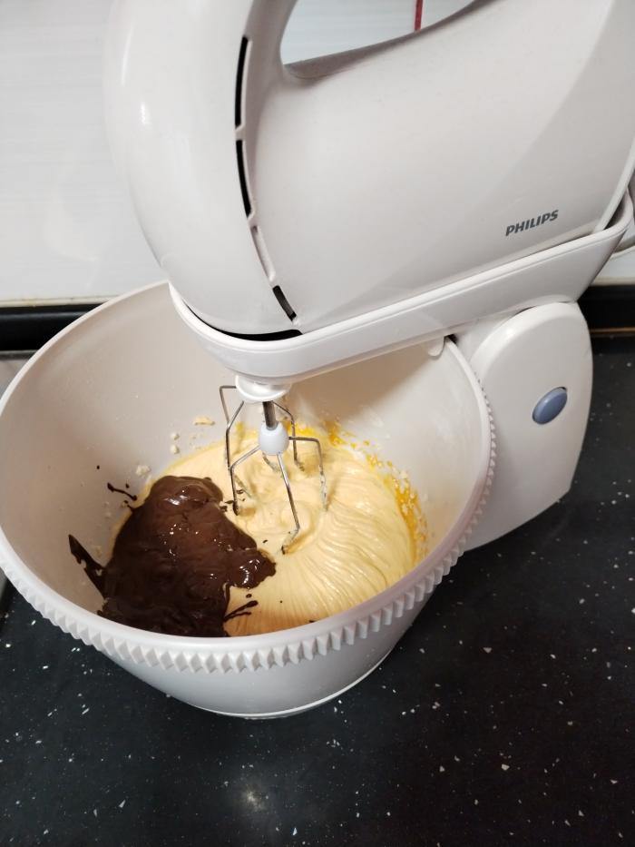 Dodajte brašno, kakao i prašak za pecivo, lagano umešajte žicom.